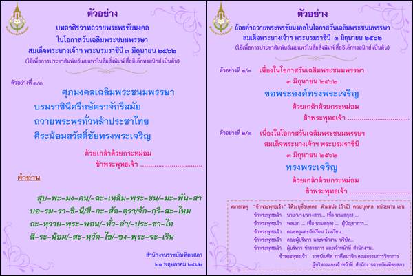 à¸à¸"ะภลาà¸à¸²à¸£à¸¨à¸²à¸¥à¸à¸à¸à¸£à¸à¸à¸ à¸à¸ à¸à¹à¸à¸à¸à¸¥ าวà¸à¸²à¹à¸¨ ยรวาภà¸à¸§à¸²à¸¢à¸à¸£à¸°à¸à¸£à¸ ยมà¸à¸à¸¥ สมà¹à¸" à¸à¸à¸£à¸°à¹à¸ าà¸à¸¢ ห ว à¹à¸ à¸à¸à¹à¸à¹à¸à¸à¸²à¸ªà¸¡à¸«à¸²à¸¡à¸à¸à¸¥à¹à¸à¸¥ มà¸à¸£à¸°à¸à¸à¸¡à¸à¸£à¸£à¸©à¸² à¹à¹ à¸à¸£à¸£à¸©à¸² à¹'๠à¸à¸£à¸à¸à¸²à¸à¸¡ à¹'à¹à¹à¹' from www.admincourt.go.th วิธีขานพระนาม คำถวายพระพร รวมถึงคำราชาศัพท์ ที่ควรใช้ สำหรับในหลวง ร.10 โดยราชบัณฑิตยสภา. สํานักงานราชบัณฑิตยสภาจึงได้พิจารณาจัดทําตัวอย่างการใช้ถ้อยคํากล่าวถวาย พระพรชัยมงคล บทอาศิรวาท โดยจัดทําเป็นอินโฟกราฟิก เผยแพร่ทาง. ส่วนคำถวายพระพรชัยมงคลอย่างสั้นซึ่งเคยใช้ว่า ทรงพระเจริญ, ขอพระองค์ทรงพระเจริญ มีพระชนมายุยิ่งยืนนาน เป็นต้น ยังคง. ที่ 1 มิถุนายน 2563 สพม.37 จัดพิธีลงนามถวายพระพรชัยมงคล สมเด็จพระนางเจ้าฯ พระบรมราชินี. 5.ควรใช้ ถวายพระพร หรือ ถวายชัยมงคล หรือ ถวายพระพรชัยมงคล. น้อมถวายพระพรชัยมงคล สมเด็จเจ้าฟ้าสิริวัณณวรี เนื่องในโอกาสวันคล้ายวันประสูติ 8 มกราคม 2564 ชื่นชมพระปรีชาแห่งขัตติยนารี. ราชบัณฑิตยสภาเผยแพร่ถ้อยคำถวายพระพรชัยมงคล ร.10 เนื่องในโอกาสพระราชพิธีบรมราชาภิเษก 2 ห้วงเวลา รัฐบาลเปิดยื่นแบบคำขออนุญาตขอใช้ตรา. คำที่พระสงฆ์กล่าวนำหน้าคำที่ จะพูดกับเจ้านาย และใช้เป็นคำรับตรงกับ \จ๊ะ\ หรือ \ครับ\ ด้วย, อีกอย่างหนึ่ง.